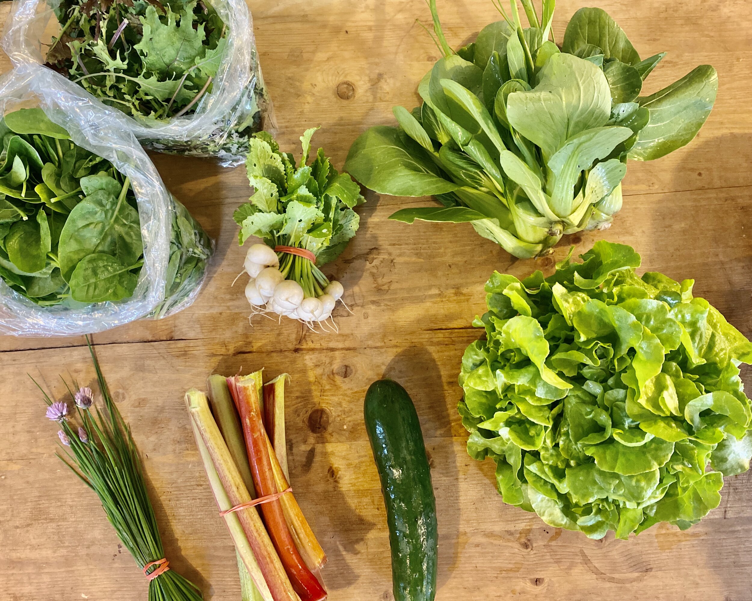 Spinach, Baby Kale, Bok Choi, Hakurei Turnips, Rhubarb, Chives, Cucumber and Green Oakleaf Lettuce Head