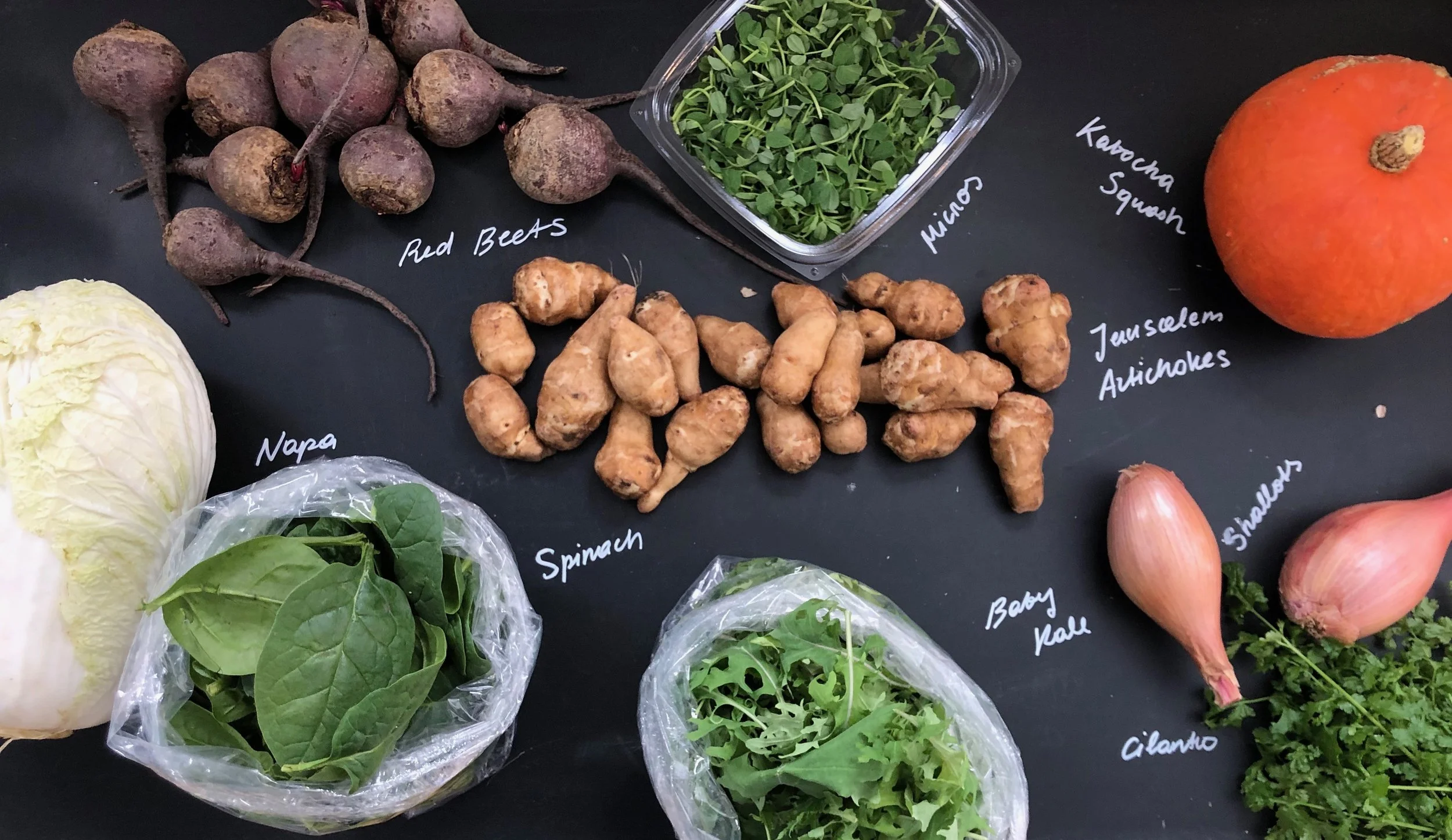 Full Share : Baby Kale, Spinach, Microgreens or Shoots, Red Beets, Jerusalem artichokes, Napa Cabbage, Sunshine Kabocha Squash, Shallots, Cilantro