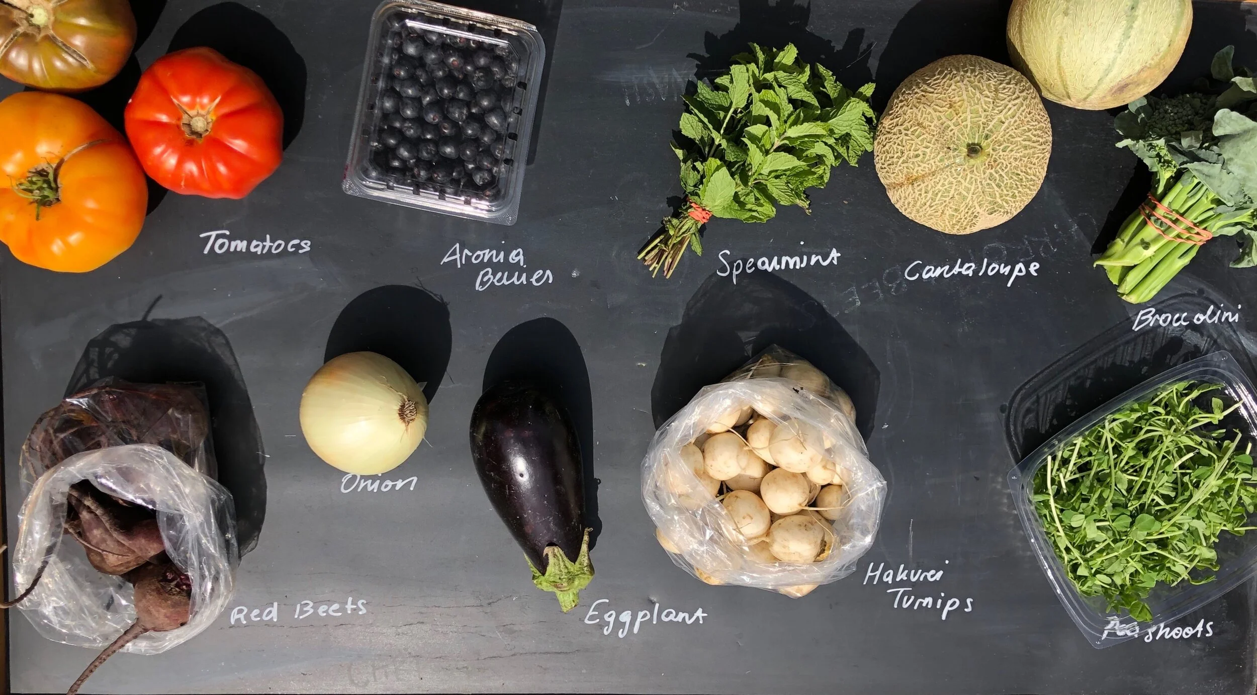 Full Share: Heirloom Tomatoes, Cantaloupe Melons, Broccoli or Broccolini, Red Beets, Yellow Onion, Aronia Berries, Hakurei Turnips, Eggplants, Spearmint, Peashoots