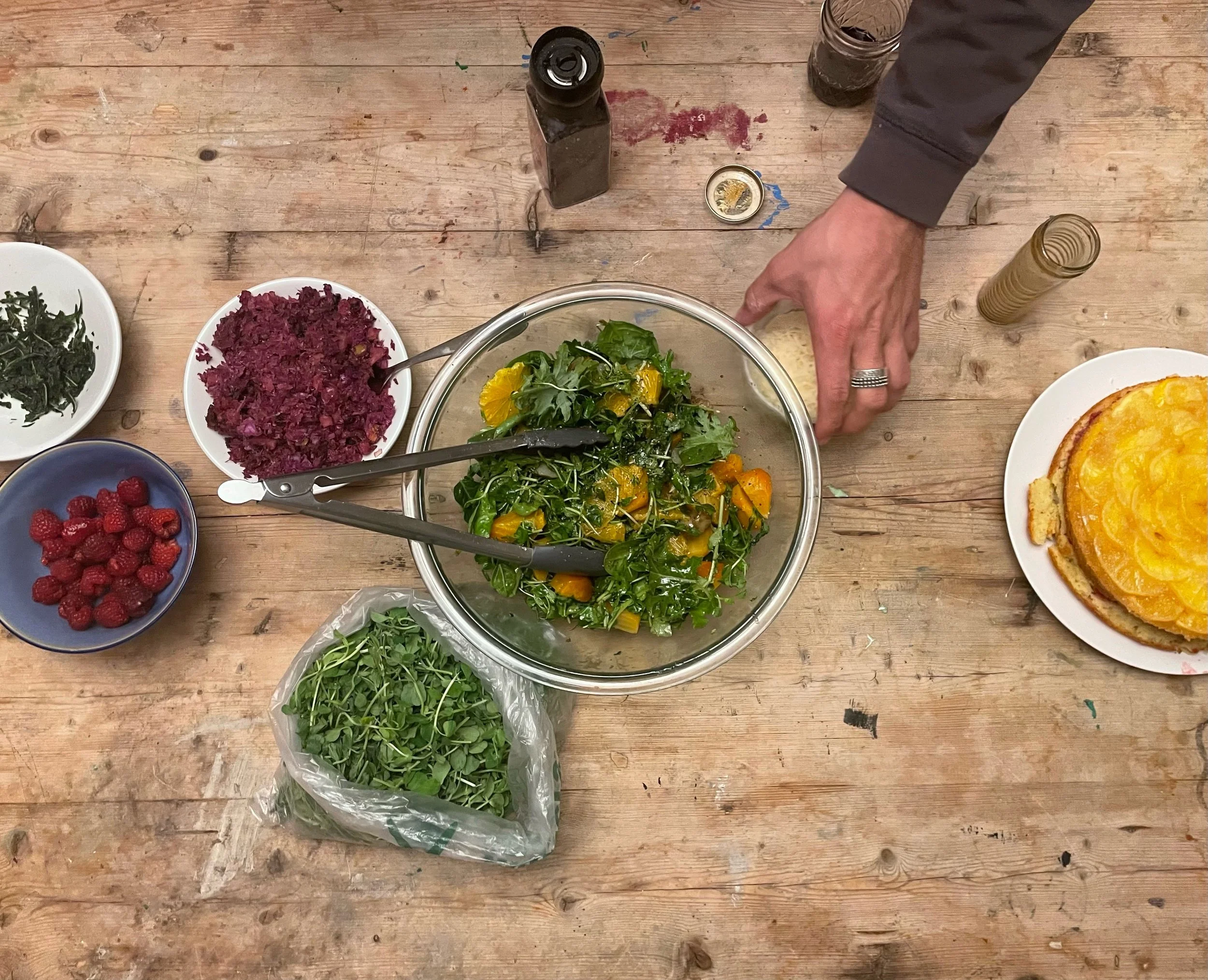 The plan was this: roast and puree the squash for squash ricotta dumplings (we used wonton wrappers to cut down time) in a brown butter sage sauce (perfect if you still have last week’s sage! and we’ll have more at the market stand if you don’t); core, shred, and sauté the cabbage for a warm apple cabbage slaw; and top a bed of arugula and pea shoots with quartered roasted beets and sunchokes for a citrusy salad. This plus a loaf of Wild Crumb bread and a lemon upside down cake that brought Betty Crocker to a level I’m not sure she’s ever reached before (though I can appreciate that she very well may have) made for a truly delicious evening. And I loved getting to go back and spend time with some of the many incredible ingredients I’ve been writing to you all about over the past few months! I still have some pureed squash in my freezer that I can’t wait to mix with ricotta, spread on some thick cut toast and topped with pea shoots, a drizzle of honey or herb oil, or some chopped nuts. All of these are available at today’s market stand! Grab a few with your CSA and put the final shreds of your winter creativity to use.