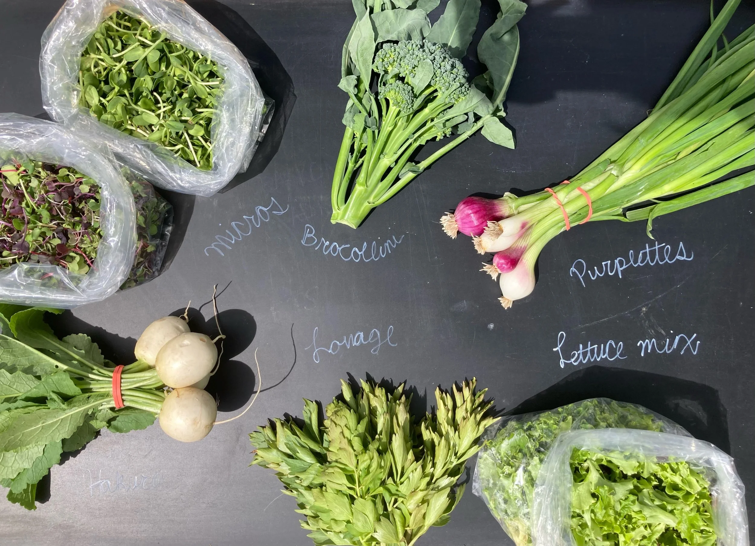 Half share: lettuce mix, hakurei turnips, broccolini, purplette onions, micros