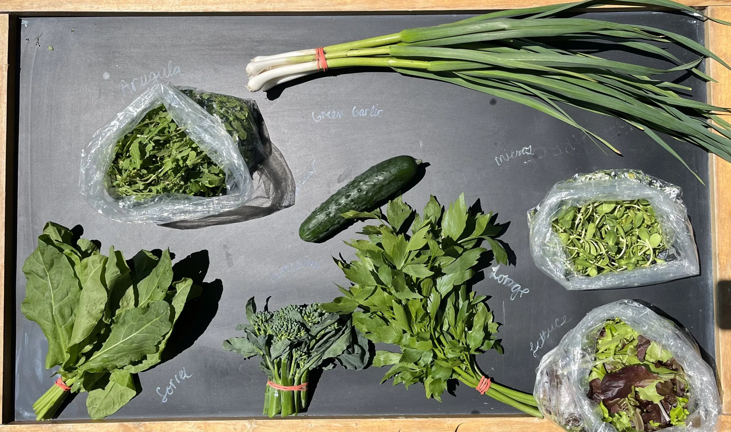 Half share: Lettuce mix, broccolini, cucumbers, green garlic, micros, spinach