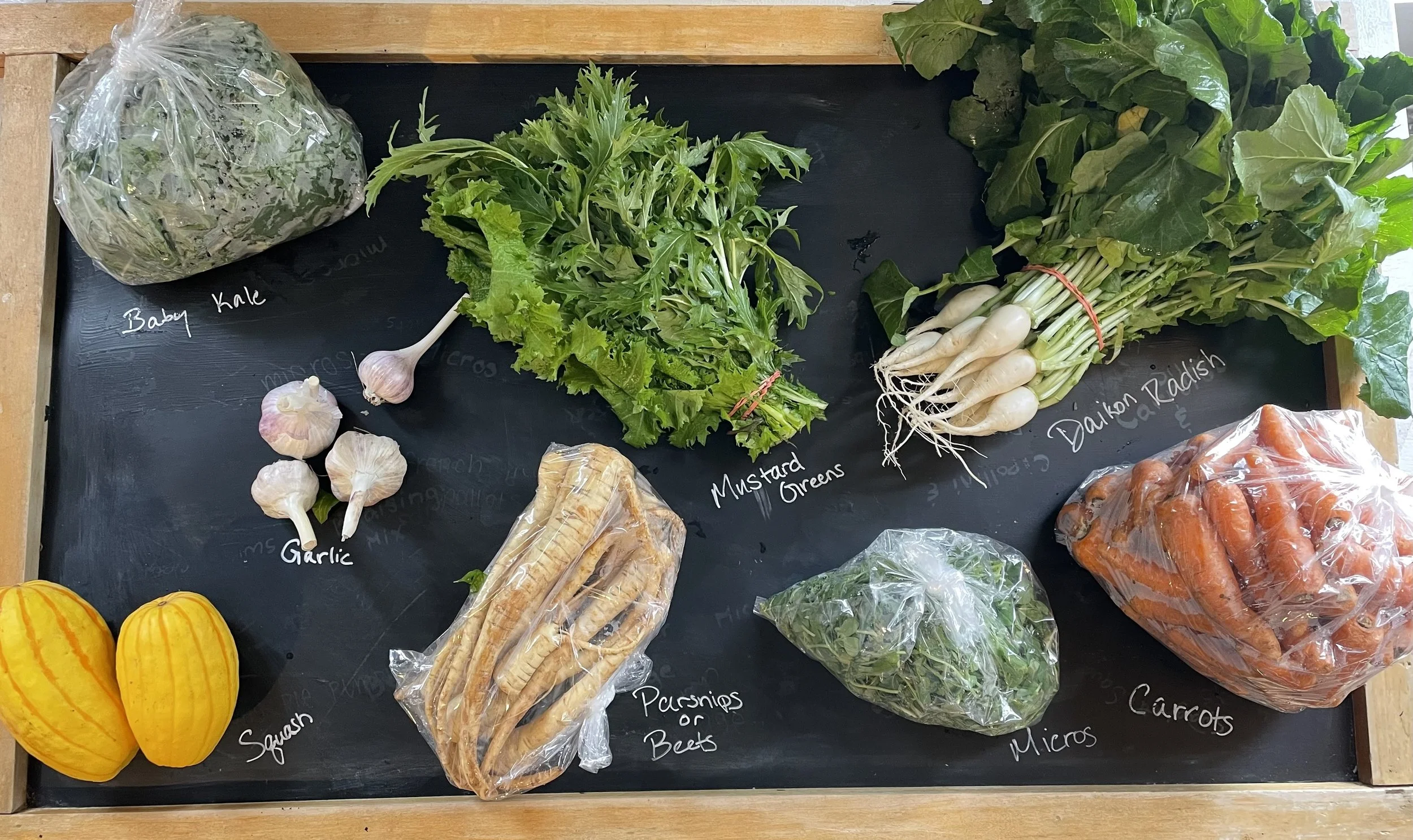 Full Share: Baby Kale, Mixed Mustard Greens, Microgreens, Daikon Radish Bunch, 4# Carrots, Choice of Beets or Parsnips, Choice of Winter Squash, 5 ct Garlic