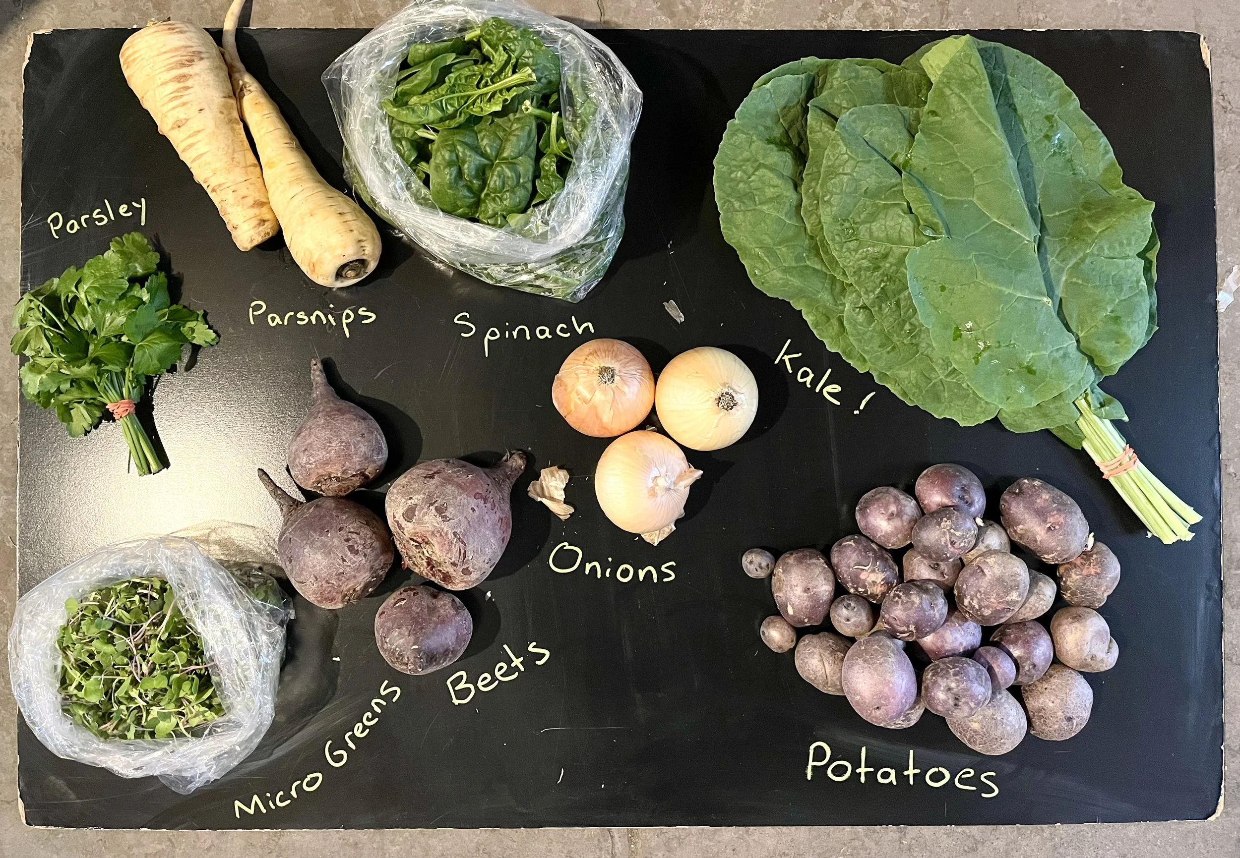 Half Share: Purple Viking Potatoes, Yellow Onions, Beets, Parsnips, Kale, Spinach, Spicy mix or Cilantro Microgreens.
