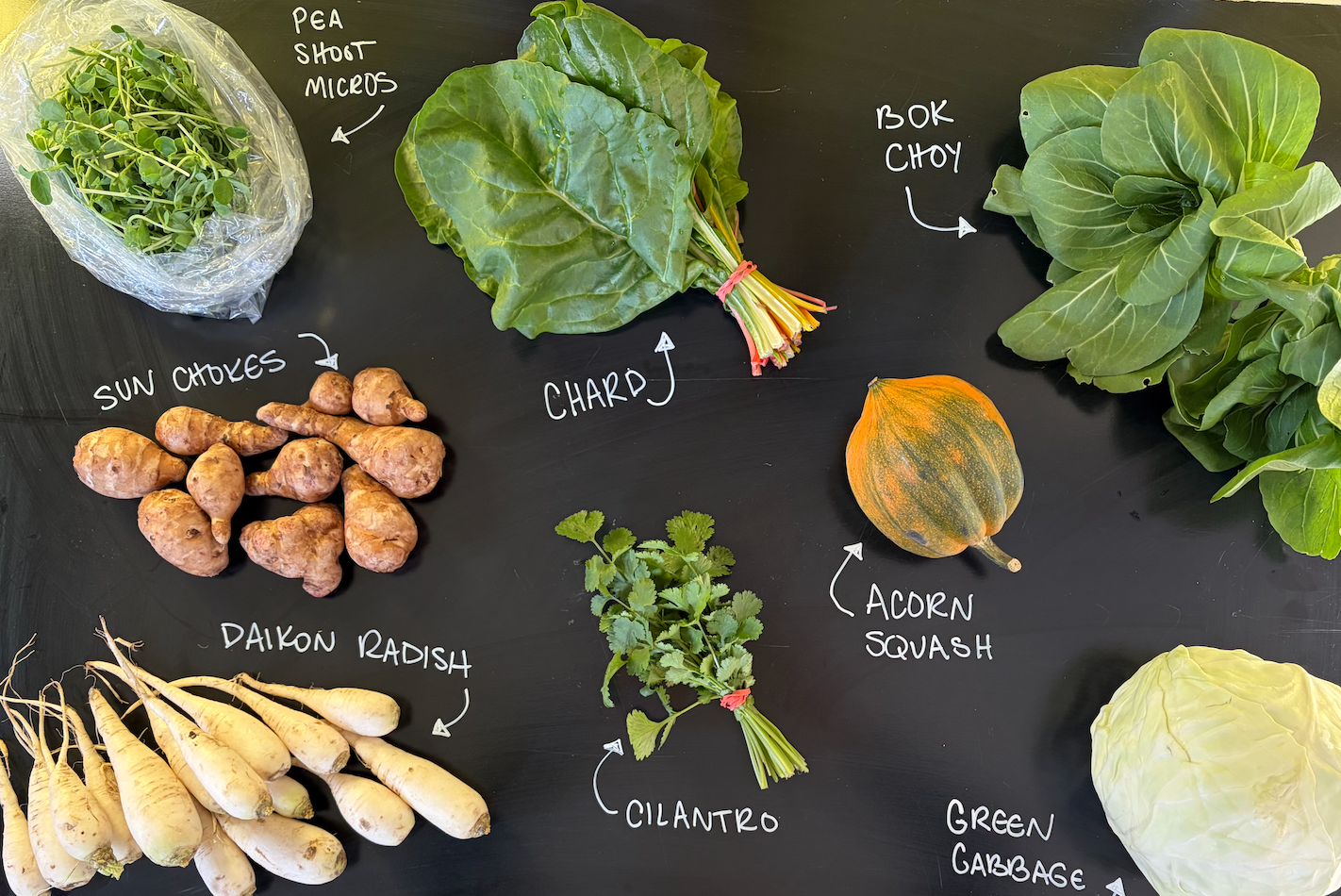 Full Share: Chard, Bok Choy, Green Cabbage, Pea Shoot Microgreens, Cilantro, Daikon Radish, Sun Chokes, Acorn Squash