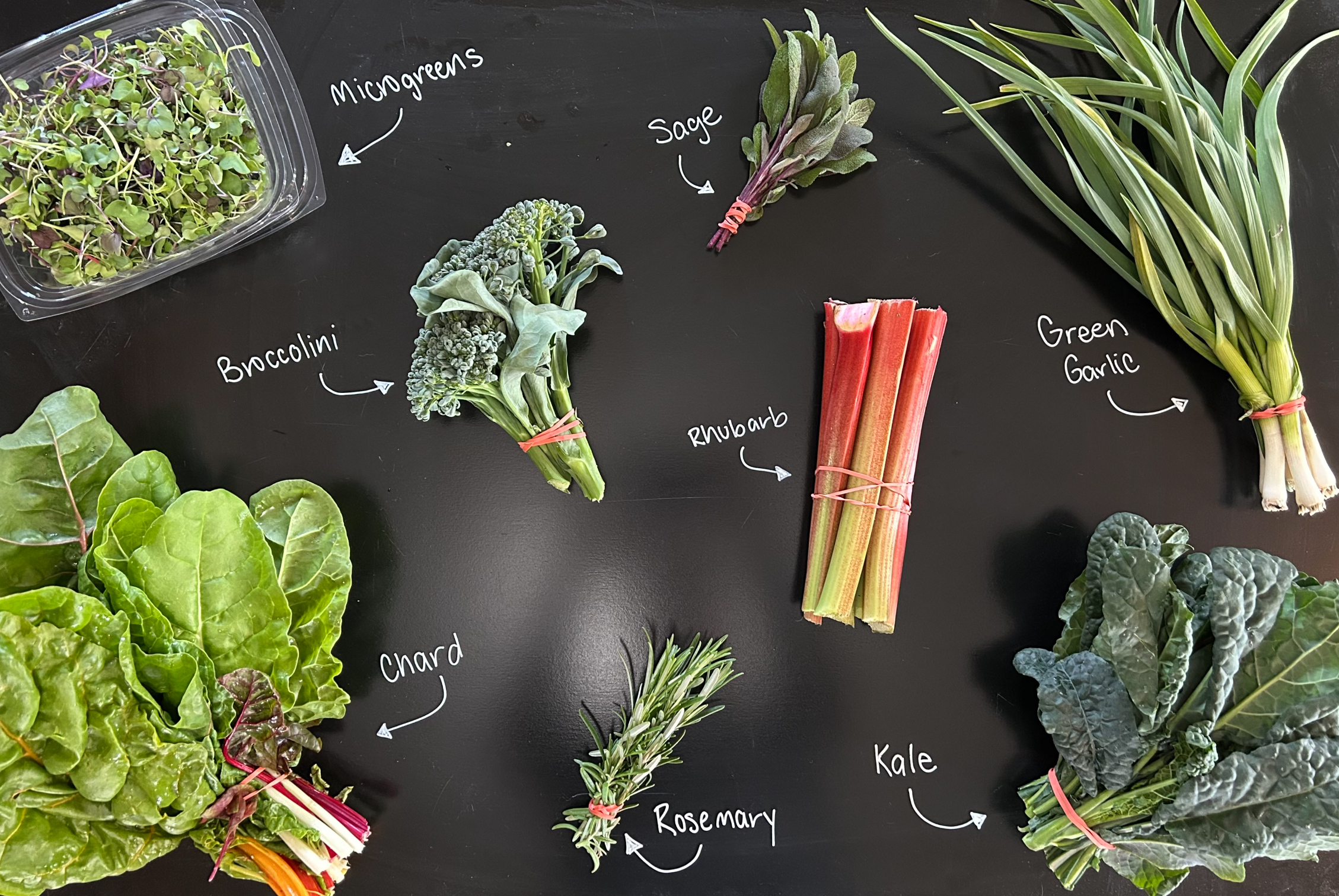 Full Share: Rhubarb, Green Garlic, Microgreens (choice of spicy or sun shoot), sage, broccolini, choice of kale or chard, rosemary