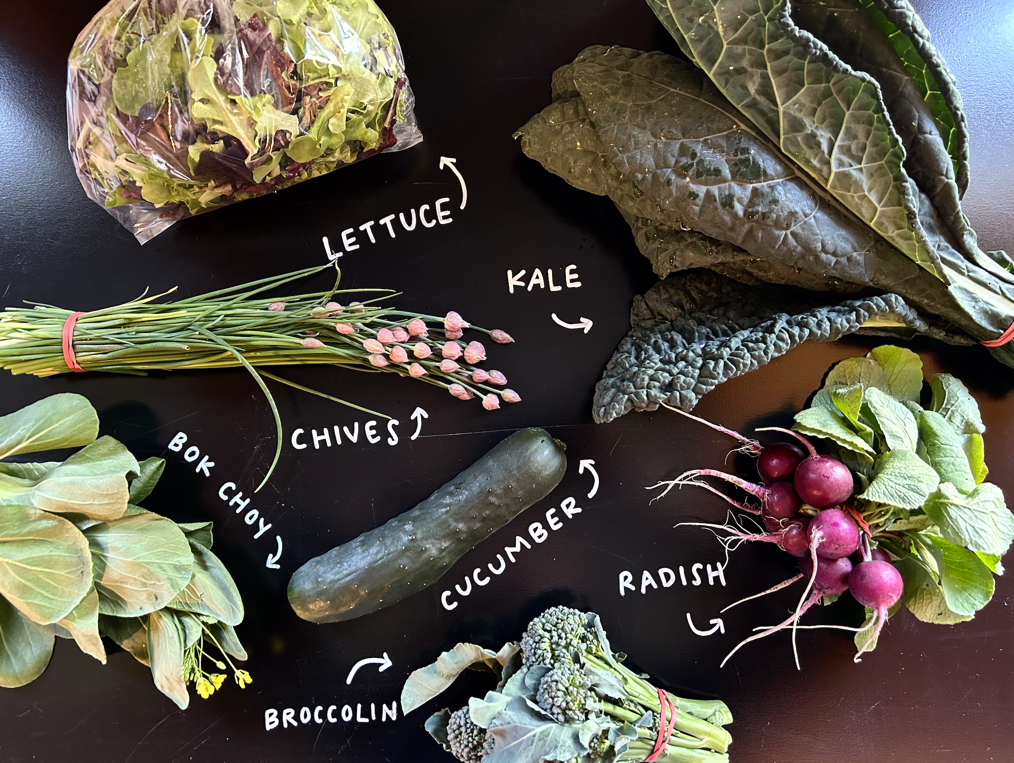 Full Share: Lettuce, kale, broccolini, radish, bok choy, chives, and cucumber.