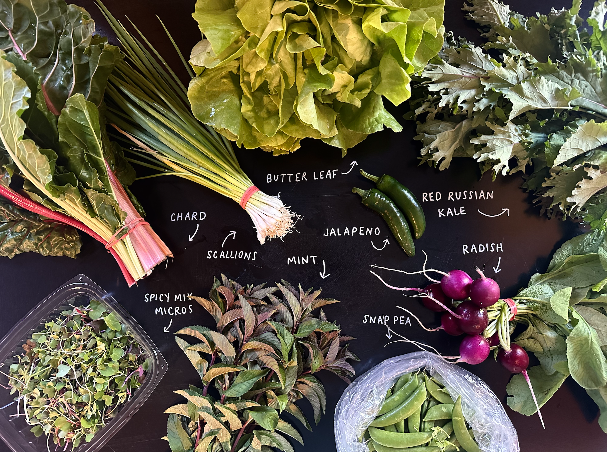 Full Share: Chard, Radish, Butter Leaf, Red Radish, Scallions, Snap Pea, Red Russian Kale, Spicy Mix Micros, Jalapeños, Mint