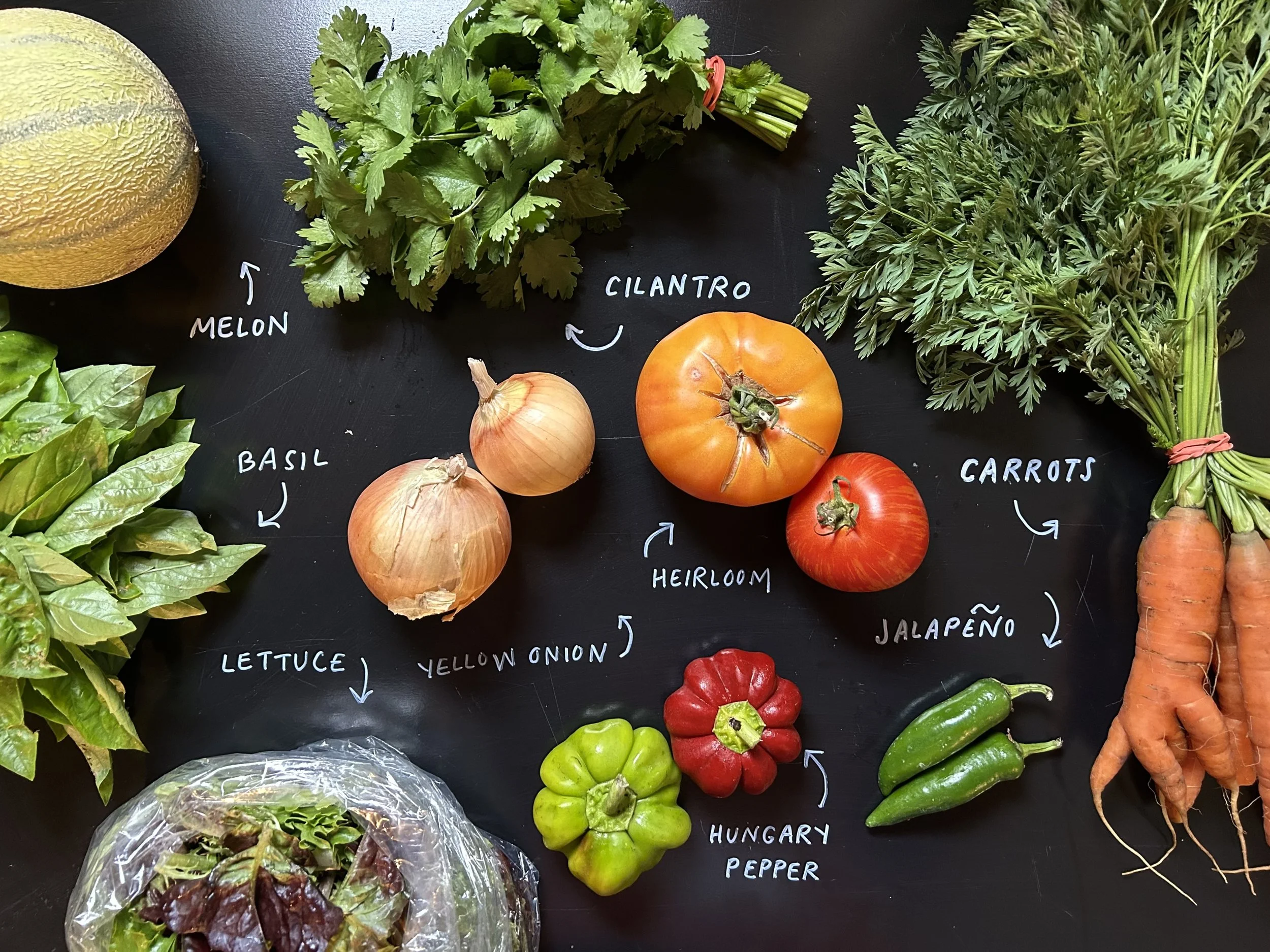 Full Share: Melon, Yellow Onion, Jalapeño, Carrot, Hungary Pepper, Lettuce Mix, Heirloom Tomato, Cilantro, Basil