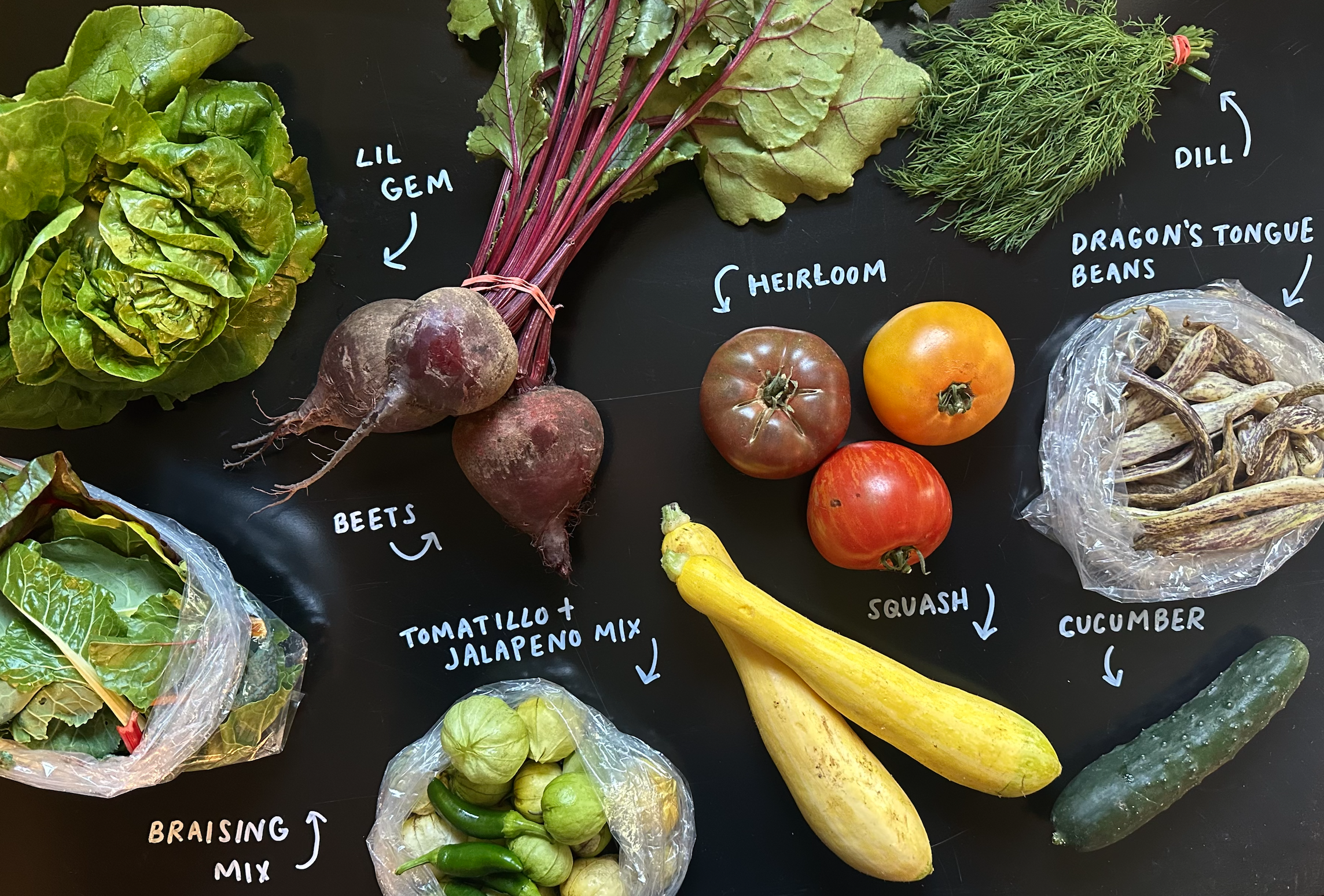 Full Share: Braising Mix, Little Gem, Beets, Tomatillo & Jalapeño Mix, Squash, Cucumber, Dill, Heirloom Tomato, and Dragon’s Tongue Beans