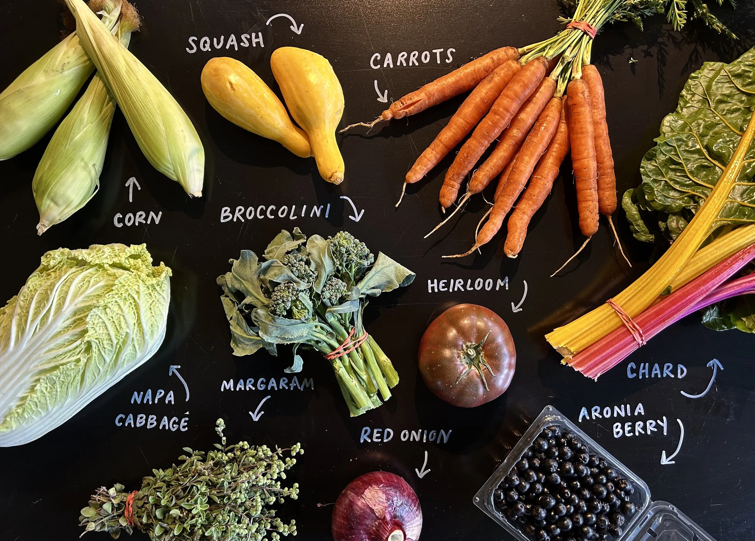 Full Share: Corn, Squash, Carrots, Napa Cabbage, Chard, Broccolini, Marjoram, Heriloom, Red Onion, Aronia Berry