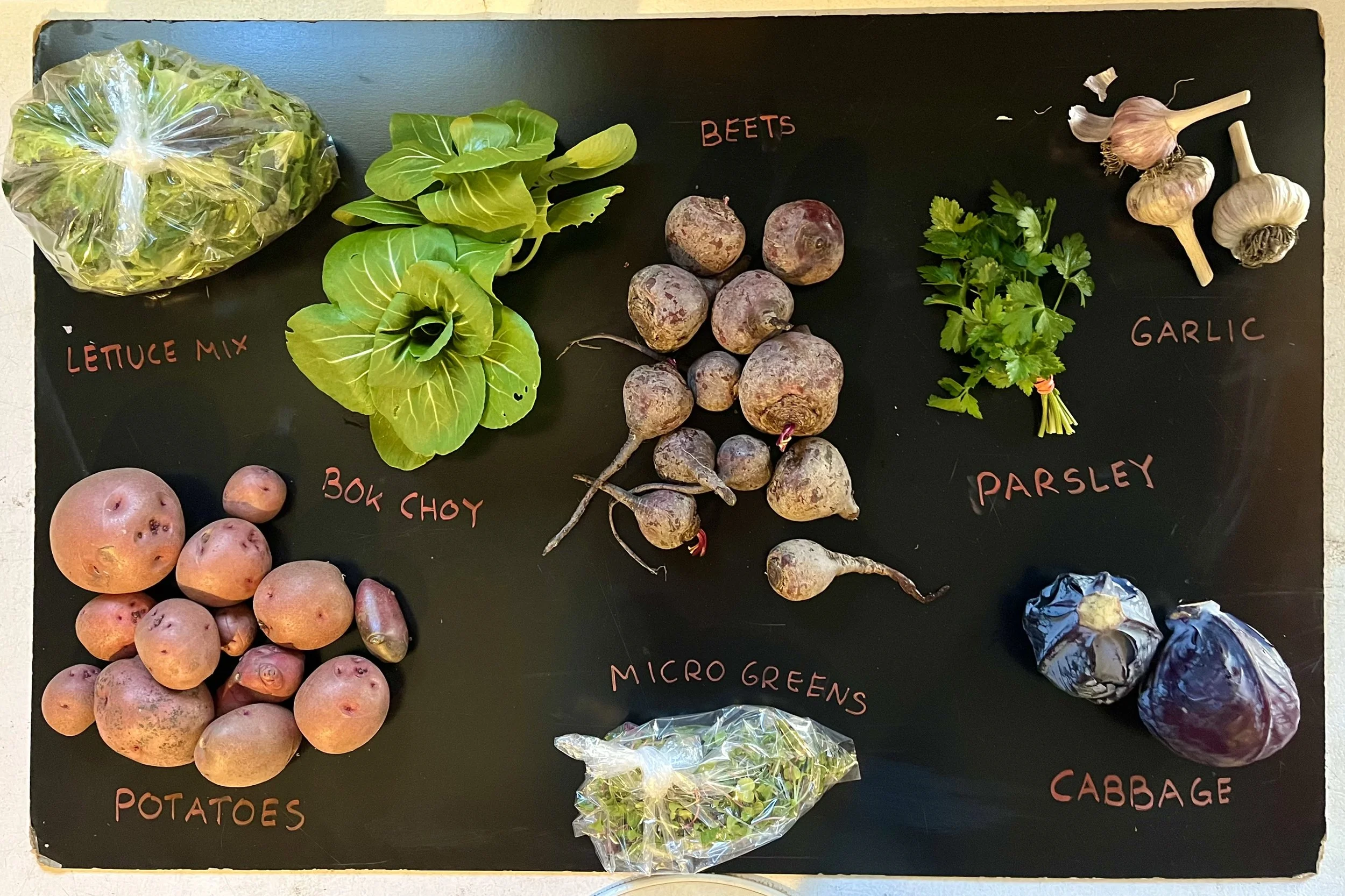 Full Share: Red Potatoes*, garlic, red beets, red cabbage, bok choy, cilantro or spicy micros, parsley, lettuce mix
