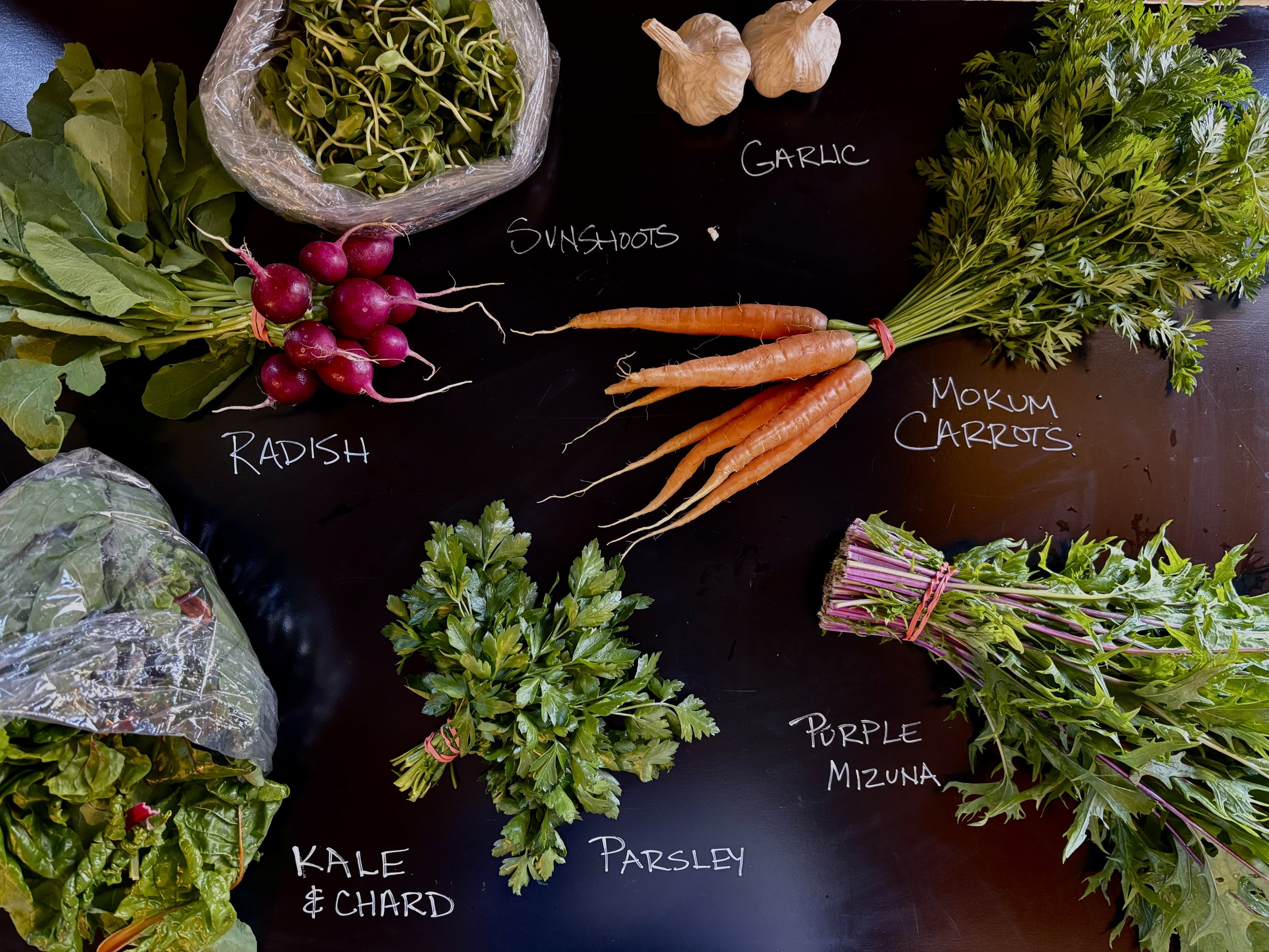 Full Share: Carrots, radish, mizuna, braising mix, sun shoot micros, parsley, garlic